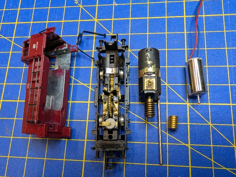 Eigentlich ist die DB nicht meine Bahngesellschaft, jedoch, nach der erfolgreichen Restauration meiner alten BR 55, hat mich das Thema gereizt. Der originale Motor ist ein rundes Teil mit abgeflachten Seiten, deren Form sich für mich relativ einfach mit Dreh- und Fräsmaschine nachbauen lässt. Motorachse genau in der Mitte, was lediglich eine mittige Ausbohrung für den Glockenankermotor erforderlich macht, damit die Achslage auch weiterhin stimmt. Die Einzelteile, Motor, passende Schnecke (Modul 0,5) und Achse, ließen sich bei bei DM-Toys ordern. Bild 1 zeigt die Ausgangssituation.