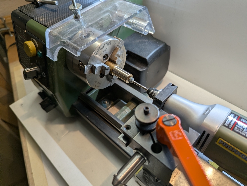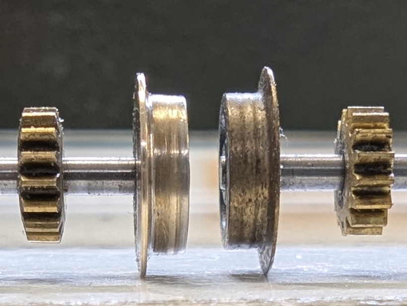 Letztendlich habe ich noch den 1 mm hohen Spurkranz um 0,2 mm reduziert, damit die Lok nicht über die Herzstücke der Peco-Code-55-Weichen holpert, bzw. über Code-40-Gleis. Dafür brauchte ich keine spezielle Spannvorrichtung. Das Rad hielt aus so in der Spannzange. Man muss nur mutig genug sein, den Drehstahl bis fast an die Fläche der Spannzange zu fahren (Bild 8). Entgratet und abgerundet wird mit 1000er Schleifpapier. Bild 7 zeigt vorher-nachher.