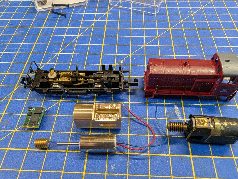 Der DHSP10A wurde mit einem roten und schwarzen Kabel versehen, die Kabel vom Motor gekürzt und an die Pads gelötet, der Baustein quer auf dem Motorträger platziert und angeschlossen. Bild 3 zeigt das Ergebnis der sehr unspektakulären Aktion. Danach lief die Lok ohne Gehäuse einwandfrei und nahezu geräuschlos. Aber zu früh gefreut ...