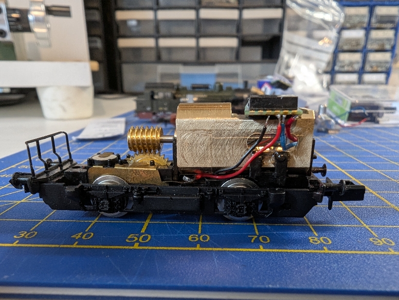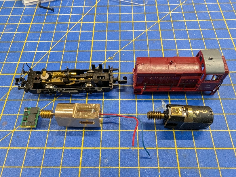 Der Motor alter Konstruktion wurde durch eine Glockenankermotor ersetzt (Bild 2). Im Führerhaus war danach genügend Platz für den gerade frisch herausgekommenen DHSP10A. Dieser vereint Decoder und Speicher in einem Baustein und vereinfacht den Einbau enorm. Die Grundfläche entspricht in etwa dem Speicher SP16A, wobei er ca. 1 mm dicker ist. Mein Exemplar ist mit 3,45 mm Dicke sogar etwas flacher als die versprochenen 3,6 mm. Trotzdem habe ich zur Sicherheit nach dem Einkleben des Motors in die Halterung noch 0,6 mm von dessen Oberseite weg gefräst (Bild 1), was sich im Nachhinein als unnötig erwies, aber egal.