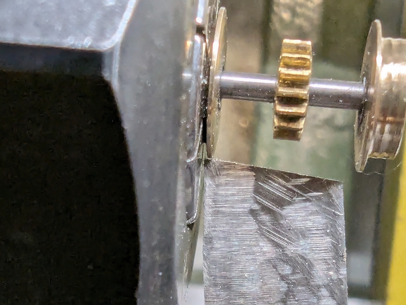 Die Schwungmasse auf der Motorachse schleift am Gehäuse (Bild 4 nach Test mit Edding), jedoch nicht oben, sondern seitlich. Grund dafür ist, dass die Schwungmasse a) leicht größer ist als das Original (8 mm statt 7,85 mm), b) nicht exakt rund läuft (was generell nicht so gut für eine Schwungmasse ist), und c) der Motorhalter eingeklebt ist, und nicht per originalen Clips gehalten wird, sich also nicht ggf. selbst in die genaue Mitte justiert. Dass die Schleifstelle nicht oben ist, konnte ich nur dadurch feststellen, dass auch mit nicht vollständig angedrückten Gehäuse die Getriebegeräusche noch da waren. Ob rechts oder links vom betroffenen Bereich (Bild 5), konnte ich nur durch sehr vorsichtiges Wegfräsen von Material mit einem Kugelfräser feststellen. An der Stelle, wo die Schwungmasse rotiert (Bild 5), ist dafür wirklich nicht viel Platz im Gehäuse!