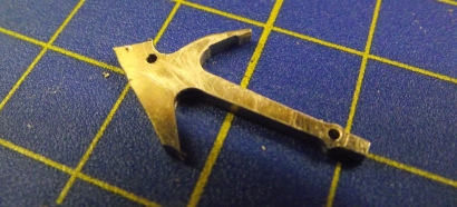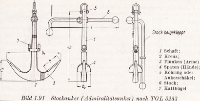 AnkerDankenswerterweise hatte mein Vater mir das Buch "Schiffbautechnisches Handbuch", Band 3, 1961 zukommen lassen, Literatur also aus genau der Zeit, als die Lotsenboote gebaut wurden. Darin geht es um die Ausrüstung von Schiffen, unter anderem um Ankereinrichtungen. Laut Bauplan Pilot 66 und der Werftzeichnung handelt es sich bei dem Anker auf dem Vordeck um die Größe 75, von der ich auf diese Weise eine genaue Zeichnung (Bild 1) inklusive Maße habe. Das Maß b1 (Armbreite) ist im Maßstab 1:50 14 mm, der Stock hat eine Dicke von weniger als 1 mm. Die einzelnen Teile des Ankers erfordern jeweils eine besondere Beschreibung, siehe weiter unten. Der Anker besteht aus: