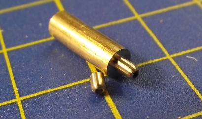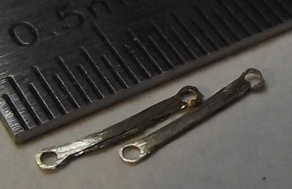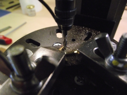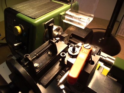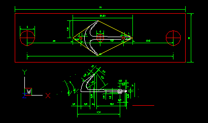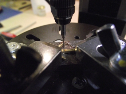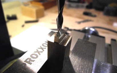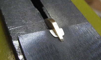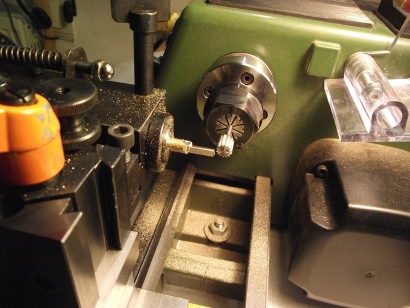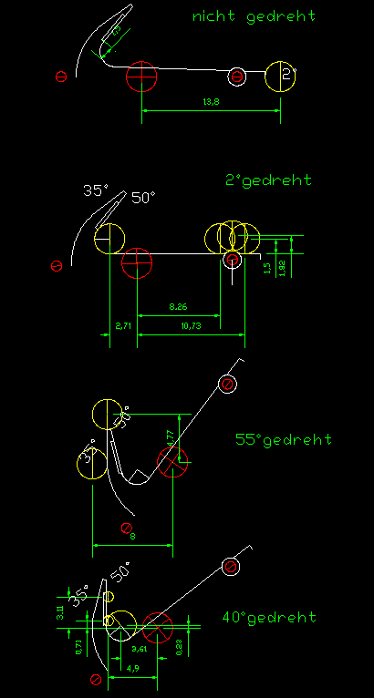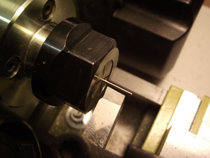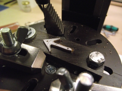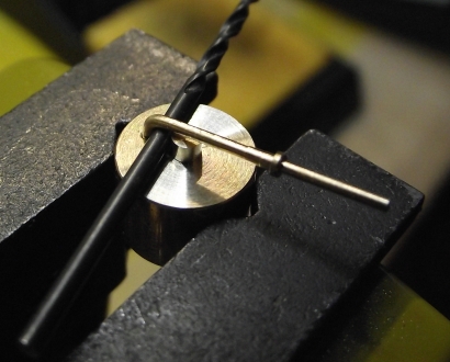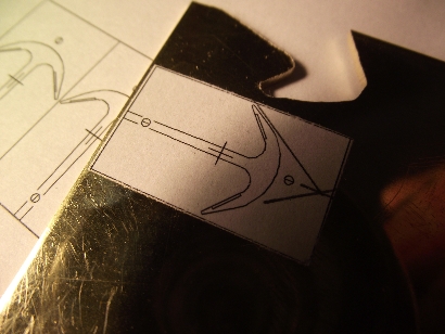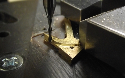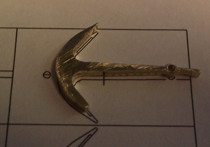 Den Kattbügel habe ich weggelassen, denn den scheint es selten gegeben zu haben. Ich nehme das Ergebnis mal vorweg (Bild 2). Der Bau hat viel Spaß gemacht, der Anker ist recht genau geworden und sieht prima aus. In unlackierte Form lässt er sich zusammenstecken und verpacken, wie es auch beim einem originalen Anker möglich ist. ![]() Bild 1 ![]() Bild 2 AnkerschaftDie Form des Ankerschaftes besteht aus Geraden und Kreisbögen. Daher bot sich an, ihn auf dem Kreuztisch mit der Fräse herzustellen. Für die notwendigen Drehungen hatte ich mir vorher einen einfachen Rundtisch für das Direktteilgerät gebaut. Für diesen musste noch eine Vorrichtung zum Spannen des Rohlings entworfen werden (Bild 4). Sie hat ein 3 mm Loch als Drehachse und zwei 1 mm Löcher, in denen Stifte stecken, von denen der linke im Bild 7 herausnehmbar ist. Die Zeichnung vom Anker wird ausgedruckt, mit doppelseitigen Klebeband auf 1,5 mm Messingblech aufgeklebt (Bild 6) und mit der Laubsäge ausgesägt (Empfehlung: Proxxon Metallsägeblätter sind große Klasse, vor allem dann, wenn man sich immer wieder verfräst und den nächsten Anker aussägen muss.). Das 1 mm Loch für den Ankerstock wird gebohrt, der Anker aufgelegt und per Koordinaten das zweite Loch gebohrt (Bild 6), der zweite Stift eingesetzt (Bild 8), der Anker von oben festgespannt und die Fräserei kann losgehen. Ich habe dabei immer nur von der gleichen Seite gefräst. Für die andere Seite habe ich den Ankerrohling umgedreht. Ausführliche Schrittfolge weiter unten. Das Teilgerät lässt nur gerastete Teilungen im 10° Abstand zu. Die 55° musste ich also per Skala einstellen. Die 2° Einstellung habe ich justiert, indem ich am Schaftende beide Seiten gefräst, die entstandene Breite gemessen und danach korrigiert habe. Die Fräserei war recht schwierig. Erst der 7. Anker gelang fehlerfrei. Bilder 12 und 13 zeigen zwei misslungene Versuche mit zu kurzem Armen und falschen Schaftwinkel. Legende für den Fräsplan in Bild 3: Weiß-Anker, grün-Maße, rot-Arretierungsstifte/Drehachse, gelb-Fräser. Gedreht wird um das 3 mm Loch in der Mitte. Dies ist auch der Nullpunkt für alle Koordinaten. Der Fräser für die Kontur hat 3 mm Durchmesser. Der Fräser für die Aussparungen der Spaten hat 1 mm Durchmesser. Der grob ausgeschnittene Anker ist auf den Stiften aufgespannt. Ist eine Seite bearbeitet, wird umgedreht aufgespannt und die gleiche Seite bearbeitet. Somit werden die Maße 2x abgefahren. Schritt 1 Vorrichtung nicht gedreht. Es wird das Ende des Schaftes auf Länge gefräst. Schritt 2 Vorrichtung um 2° gedreht. Jetzt steht die Kante des Schaftes in x-Richtung gerade und kann gefräst werden. Die innere Rundung der Arme ist der Fräserdurchmesser, also 3 mm. Schritt 3 Vorrichtung um 40° gedreht. In dieser Stellung greift die Rastung des Teilgerätes. Die Innenkante der Arme steht in y-Richtung. Beide Arme werden gefräst (Bild 9). Schritt 4 Vorrichtung um 55° gedreht. Keine Rastung, Einstellung nach Skaleneinteilung. Die Außenkante der Arme steht in y-Richtung. Gefräst werden das Armende und der gerade Teil durch Bewegen vom Kreuztisch. Schritt 5 Vorrichtung wieder um 40° gedreht und gerastet. Die Innenkante der Arme steht wieder in y-Richtung. Auf den 1 mm Fräser wechseln und die Aussparung der Spaten fräsen (Bild 10). Schritt 6 1 mm Fräser an die Unterkante fahren. Rastung entfernen und durch vorsichtiges Drehen des Tisches die untere Rundung mit mehreren Tiefenzustellungen fräsen (Bild 11). Zum Schluss kommt das 0,5 mm Auge für den Schäkel in den Schaft. Danach müssen die Arme auf Ober- und Unterseite verjüngt werden. Ich habe sie einfach gefeilt. Erst eine Seite mit ständiger Dickenkontrolle, dann die andere. Dabei alles gleich schön entgratet und mit 1000er Schleifpapier poliert (Bild 14). ![]() Bild 3 ![]() Bild 4 ![]() Bild 5 ![]() Bild 6 ![]() Bild 7 ![]() Bild 8 ![]() Bild 9 ![]() Bild 10 ![]() Bild 11 ![]() Bild 12 ![]() Bild 13 ![]() Bild 14 AnkerstockDer Ankerstock habe ich einfach als 0,9 mm dicke Stange mit einer Verdickung an einer Stelle gedreht (Bild 16). Dabei muss man lediglich beachten, dass dieses lang aus dem Spannfutter herausstehende Teil in Etappen zu bearbeiten ist. Die längere, später abzuwinkelnde, Seite wird in der Nähe an der Verdickung nur auf 1 mm gedreht, damit der Sperr-Ring dort leicht klemmt. Die beiden Kugeln an den Enden mit 1,8 mm Durchmesser habe ich per gestuftes Formdrehen (Bild 15) hergestellt. Ein Stück Rundmaterial bekommt an beiden Enden einen Zapfen von 1,8 mm Durchmesser, der eine ca. 1 mm tiefe 0,9 mm Bohrung erhält. Dann wird die eine Hälfte der Kugel lt. Maßen in Bild 15 geformt. Geglättet werden die Stufen mit Dreikantschaber und Schleifpapier. Im Bild 17 ist einer der Zapfen bereits mit der Laubsäge vom Bolzen getrennt. An die Enden von denselben Bolzen werden jetzt 0,9 mm Zapfen angedreht (Bild 18) und die Teile im 0,9 mm Loch angelötet. Jetzt kann die andere Kugelhälfte bearbeitet werden. In Bild 19 ist die linke Kugel bereits fertig gedreht, die rechte muss noch bearbeitet werden. Die fertigen Kugeln werden dann nur noch vom Bolzen abgelötet (Bild 20). Im Bild 21 ist die einfache Biegevorrichtung für den Ankerstock zu sehen. Biegeradius ist 0,7 mm. Die Vorrichtung bekam am Rand eine 0,9 mm Bohrung. Der Zapfen ist 1,4 mm hoch und so weit abgedreht, dass ein 1,4 mm Bohrer dazwischen passt. Ankerstock in der richtigen Länge in das Loch stecken, umbiegen wie im Bild, fertig. Das umgebogene Ende wird noch auf die richtige Länge gebracht. Zum Zusammenbau wird die Kugel auf den geraden Teil gelötet, dann der Ankerstock in den Schaft gefädelt, der Sperr-Ring aufgeschoben und dann die zweite Kugel auf das abgewinkelte Ende gelötet. Für den Sperr-Ring, der im Bild 2 beim entfalteten Anker zu sehen ist, habe ich leider kein Bild der Herstellung. Es wird ein 1,6 mm Zapfen angedreht, 1 mm angebohrt und die Kanten verrundet. Dann mit der Laubsäge vorsichtig abgetrennt. De