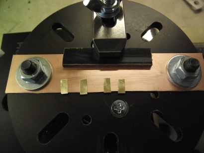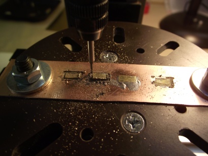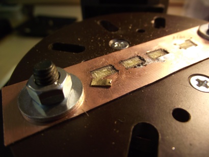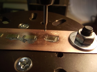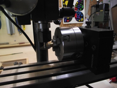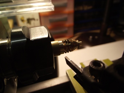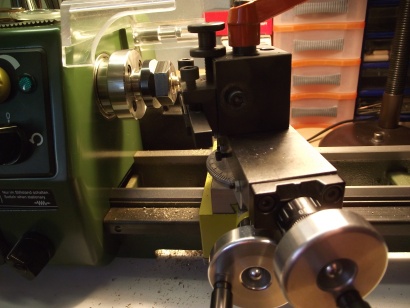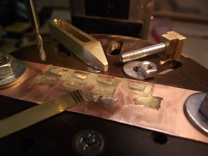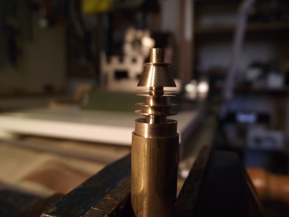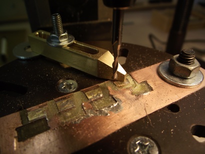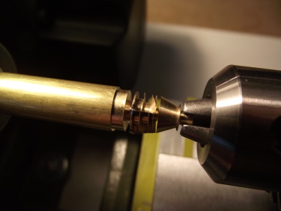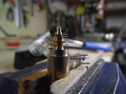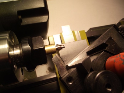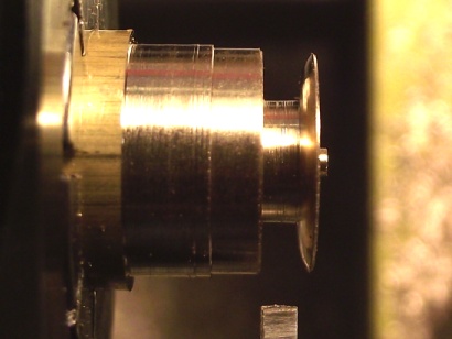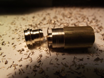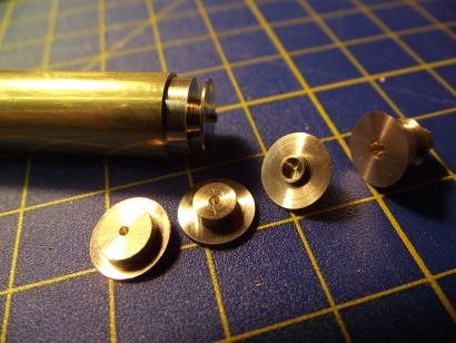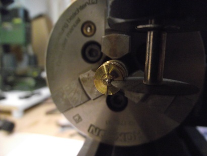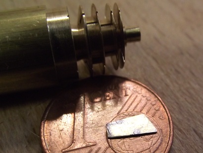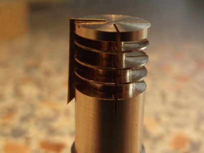 Lüfter 'Küchenmixer', erster Versuch (misslungen)Hinten auf dem Dach vom Führerhaus steht auf Steuerbord ein Lüfter, dessen Form Ähnlichkeiten mit einem Küchenmixer hat. Wofür eine solche Bauform zweckmäßig ist, ist mir nicht ganz klar. Man findet sie jedoch ähnlich auch in den verschiedensten Formen als Gebäudelüfter. Leider habe ich nur ein paar verpixelte Aufnahmen vom Original und die Außenmaße von der Werftzeichnung. Der Lüfter hat ein kegeliges Dach, kegeligen Fuß, einen inneren auf der Spitze stehenden Kegel, waagerechte Scheiben in der Mitte und 4 senkrechte Wände zur Abstützung. Bild 1 zeigt einen Rekonstruktionsversuch. Erst nach längerem Überlegen bin ich darauf gekommen, wie man ein solch kompliziertes Teil nachbilden kann. Bild 2 zeigt den vielversprechenden Test. Der runde Lüfterkörper wird gedreht. Dann werden senkrechte Schlitze eingesägt, bzw. geschliffen, und die Stützwände eingelötet. Was im Bild 2 scheinbar funktioniert, ging in der Praxis nicht. Die 0,2 mm dünnen Ringe bogen sich beim Drehen aus dem Vollen weg, wie die Bilder 3 und 4 zeigen. Der runde Teil muss aus Einzelteilen zusammengesetzt werden (Bild 8), wobei die dünnen Scheiben am Spannzangenfutter einen Gegenhalt haben (Bild 5). Im Bild 6 wird der kegelige Fuß gedreht und im Bild 7 sind die 14° kegelige Dachschräge am Obersupport eingestellt. Dieses Bild verdeutlicht, dass es wohl keine gute Idee wäre, schöne größere Handräder an die Supporte zu bauen. Bild 9 zeigt alle Teile übereinandergestapelt und in Bild 10 sind sie verlötet, bis auf den fehlenden Fuß, denn jetzt wird geschlitzt. Geschlitzt wird vorsichtig mit einer 0,2 mm dünnen Trennscheibe, denn ein Sägeblatt würde vermutlich die dünnen Scheiben verbiegen. Mit dem Teilgerät klappte das sehr gut (Bilder 11 bis 14). Problematisch wurde die Herstellung der trapezförmigen senkrechte Wände aus 0,2 mm dünnem Blech. Die Technik: Ich löte die grob auf Maß geschnittenen Teile auf eine kupferkaschierte Platine (denn Spannen kann man so kleine Teile kaum), umfräse den Umriss auf dem Drehtisch nach Skalen und löte sie anschließend ab. Ein wenig überraschte mich dann, dass der 1 mm "Fräser" nach kurzer Zeit abbrach. Ich schob es auf die geringe Drehzahl der "großen" Fräse und wechselte auf die kleine, die ja 20000 U/min schafft. Auch fräste ich mit dem Stumpf weiter, denn die Stirnschneiden brauche ich sowieso nicht, dachte ich. Dann schnipsten mir 3 der Trapeze weg! Letztendlich bemerkte ich, dass ich mich bei der Auswahl des Fräsers vergriffen hatte. Ich hatte einen 1 mm Bohrer (!) erwischt. Der fräst natürlich deutlich schlechter und drückt mehr auf der Schnittfläche herum (Bild 19). Ein zweiter Versuch mit einem tatsächlichen Fräser war dann erfolgreich. Trotzdem hatte ich mir ein kleines Spanneisen (Bild 20) gefräst, mit dem das jeweils zu bearbeitende Teil zusätzlich angedrückt werden konnte. Im Bild 22 sieht man vorne einen extra dünn gefrästen Blechstreifen, den ich beim Ablöten zwischen Plättchen und Lötkolben halte, damit nicht auch noch die andere Seite des Plättchens Lötzinn abbekommt. Im Bild 23 kuscheln die 4 verputzen Seitenwände auf der Schneidmatte. Bild 24 zeigt dann die Katastrophe beim Einlöten der Plättchen. Das erste Plättchen fand seinen Platz. Beim zweiten rutsche ich so unglücklich mit dem Lötkolben ab, dass sich die dünnen Scheibchen verbogen und teilweise abbrachen. Was jetzt? Alles noch einmal bauen? Ich hatte mir überlegt, wie ich den Lüfter auch anders und einfacher herstellen könnte. Also legte ich eine Baupause ein und widmete mich ein paar anderen Dingen. Für den zweiten, diesmal gelungenenen, Versuch gibt es eine extra Seite.