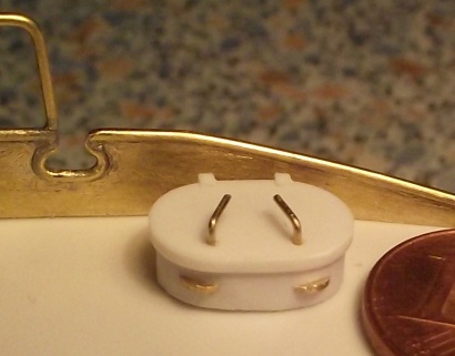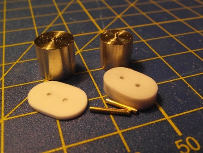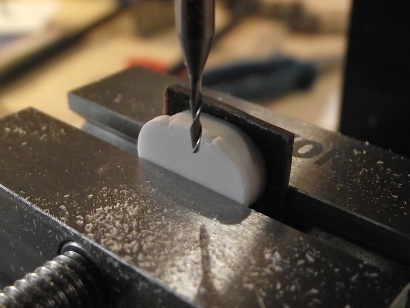 Hier geht es um die runde Luke auf dem Vorschiff, die ein ganzes Stück aus dem Deck hervorragt. Die Vortreiber (Verriegelungen) greifen von innen in Ausbuchtungen in der Wand der Luke, wie man auf den Zeichnungen sehr schön erkennen kann. Diese Ausbuchtungen wollte ich unbedingt darstellen. Die Herstellung und genaue Positionierung war nicht ganz einfach. Bild 1 zeigt diesmal etwas ausführlicher die bemaßten Zeichnungen der Luke sowie der Hilfsmittel für den Bau. Links die Luke selber. In der Mitte die Fräsvorrichtung für die Ausbuchtungen. Rechts die Vorrichtung zum Ankleben der Ausbuchtungen an den Lukenkörper. Die Luke sollte aus Polystyrol hergestellt werden. Zunächst versuchte ich die Form, bestehend aus zwei Halbkreisen und einem geraden Mittelteil auf dem Drehstisch zu fräsen. Das funktionierte nicht genau genug, wie Bild 2 zeigt. Also habe ich die Luke aus zwei Teilen gefeilt, dem 3 mm dicken Lukenkörper und dem 1 mm dicken Deckel. Um die Wände auch wirklich kreisförmig zu bekommen, habe ich mir zwei "Feilkörper" mit 1 mm Zentrierzapfen gedreht. In das Polystyrol wurden per Koordinatenbohren zwei 1 mm Löcher im richtigen Abstand gebohrt - im Deckel nicht ganz durchbohrt. Dann habe ich die Umrisse grob angezeichnet, ausgesägt und Polystyrol und Feilkörper in den Schraubstock gespannt. Vorsichtig, ohne die Feile zu verkanten, konnte ich somit die Kreisbögen "erfeilen". Bild 3 und Bild 4 sollten das Prinzip erkennen lassen. Körper und Deckel wurden dann übereinander geklebt, wobei zwei 1 mm dicke Stiffte für Passgenauigkeit sorgten. Dann habe ich an eine Seite mit einem 1 mm Fräser die Nuten für die Scharnierimitate gefräst (Bild 5). Diese habe ich aus kleinen Stücken Polystyrol eingeklebt und die Oberseite dann so geschliffen, dass sie noch leicht erhaben überstehen. Die Löcher für die Vortreiber hätte ich besser bereits beim Bohren der "Feilkörperlöcher" anbringen sollen. So musste ich sie später per "Koordinatenertasten" genau platzieren. Ging aber auch so genau genug. Jetzt zu den Ausbuchtungen der Vortreiber. Sie sitzen auf dem 8 mm Durchmesser an der Lukenwand und haben selbst einen Außendurchmesser von 3 mm. Also habe ich ein 3 mm Rundmessing genau senkrecht in die Fräsmaschine gespannt und mit einem 8 mm Fäser vorsichtig den Berührungspunkt ertastet und dann ebenso vorsichtig 2,42 mm weiter gefräst (vergleiche Bild 1 Mitte). Es entsteht ein Stück halbmondförmiges Profil (Bild 6), von dem ich mit der Trennscheibe 0,6 mm dicke Scheiben abschneiden konnte (Bild 7). Es verblieb dabei erstaunlich wenig Grat an den Teilen. In Bild 8 liegen die winzigen Teile auf der Luke, aber wie bekommt man die jetzt genau an die richtigen Stellen geklebt? Bild 9 zeigt die fertige Vorrichtung. Die Maße habe ich per CAD-Zeichnung ermittelt und die Teile per Koordinatenfräsen bzw. Bohren hergestellt. Im Bild 1 sieht man rechts die zugehörige Zeichnung. Die Genauigkeit ergibt sich daraus, weil die beiden Löcher zum Aufstecken der Führungstifte der Luke, die Löcher für die Führunsstifte des mittleren Anschlagteils in der Grundplatte per Skalen gebohrt werden. Das Anschlagsteil selber ist ebenfalls auf der Fräse nach Skalen gebohrt und gefräst. Grundplatte und Anschlag werden zusamengesteckt und verklebt. Höhenanschlag für die notwendigen 1,6 mm bilden die beiden seitlich aufgeklebten Dreiecke (siehe Bild 9). Die Luke wird aufgesteckt, die Klebeflächen bekommen einen winzigen Tropfen Sekundenkleber und eine Ausbuchtung wird mit einer Pinzette in die "Ecke" geschoben und eine Weile angedrückt. Hält! Bleiben noch die Vortreiber selber. In einer Biegevorrichtung (Bild 10) werden zwei 0,5 mm Drahtstücke abgewinkelt. Die Biegevorrichtung ist ein Drehteil mit einer 0,5 mm Bohrung und einem aufgeklebten Stück 1 mm Messingdraht für eine Biegeradius von 0,5 mm. Drahtstück auf die richtige Länge schneiden, Enden verputzen, einstecken, umbiegen, fertig. Die Luke hat diese Art primitiv aussehender Hebel auch im Original. Im Bild 11 posiert die fertige noch unlackierte Luke an ihrem zukünftigen Ort auf dem Vordeck.