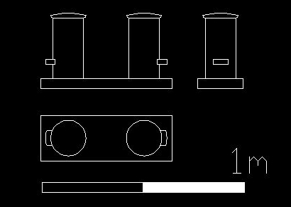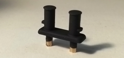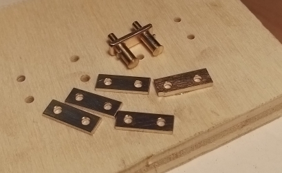 Um den Sockel (auch genannt Fundament) maßgenau herzustellen, habe mir auch dafür eine Haltevorrichtung gebaut. Bild 16 zeigt sie leider nicht sehr genau. Sie besteht aus zwei dünnen Pertinax-Platten von denen die obere 2 Löcher im Abstand der Pollersäulen hat und die untere nur als Abstandshalter für zwei gedrehte Stifte dient. Sie Stifte ragen ca. 1 mm über die obere Platte. Sie haben unten deshalb eine breite Basis, damit sie flach auf dem Frästisch liegen. Die Vorrichtung wird parallel ausgerichtet auf den Frästisch gespannt. Aus einem Messingwinkel der richtigen Materialstärke habe ich per Koordinatenbohren Löcher gebohrt und die Sockel mit etwas Übermaß mit der Laubsäge ausgeschnitten. Bild 17 zeigt die aufgespannten Teile und den Fräser in Aktion. Ich fräse immer nur zwei Seiten. Dann spanne ich das Messing aus, drehe es um 180 Grad und fräse wieder die beiden Seiten. Danach messe ich das Teil aus und kann ausrechnen, wie viel ich in x- und y-Richtung noch zustellen muss. Der gefundenen Wert wir genullt und ich kann alle Sockel ohne nachmessen fräsen. Als Ergebnis haben wir Sockel, deren Maße gleich sind und deren Bohrungen für die Pollersäulen genau mittig sind. Bild 19 zeigt 4 gelungene Sockel und einen, bei dem ich mich verfräst hatte.