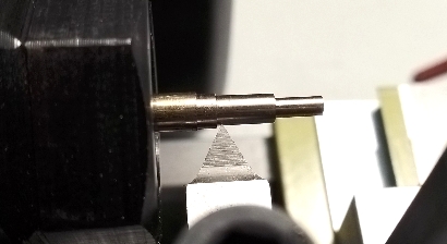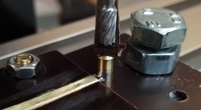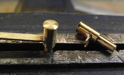 Die Bilder 8 und 9 zeigen die Herstellung der Löt/Fräs-Vorrichtung für die Nase. In Bilder 10 und 11 ist zu sehen, wie die Nase an den Poller kommt. Ein 2 mm breiter Messingstreifen wird in dem flachen Schlitz per Hand an den Fräser geschoben, der den gleichen Durchmesser wie der Poller hat. Das Ende des Streifens bekommt damit die nötige gerundete Lötfläche. Der Fräser wird angehoben und der Poller eingesteckt. Mit dem Fräser wird der Poller festgeklemmt, wobei ein Stück Pertinax zwischengelegt wird, damit der Fräser nicht den Kopf zerkratzt. Das Blech wird entgratet und die Kontaktfläche vom Blech (nicht vom Poller) wird verzinnt. Auf Pollerseite wird ein Tropfen Lötwasser als Flußmittel aufgebracht. Dann wird der Blechstreifen in der Rille gegen den Poller gedrückt und die Stelle mit einem nicht zu kleinem Lötkolben erwärmt (Bild 11). Das Blech wird dann in einen Schraubstock gespannt und dicht am Poller mit einer Laubsäge abgetrennt (Bilder 12 und 13). Die richtige Länge bekommt die Nase wieder auf der Drehmaschine (Bild 14). Als letzten Schritt wird die Nase entgratet und überschüssiges Lötzinn mit einem Dreikantschaber entfernt.