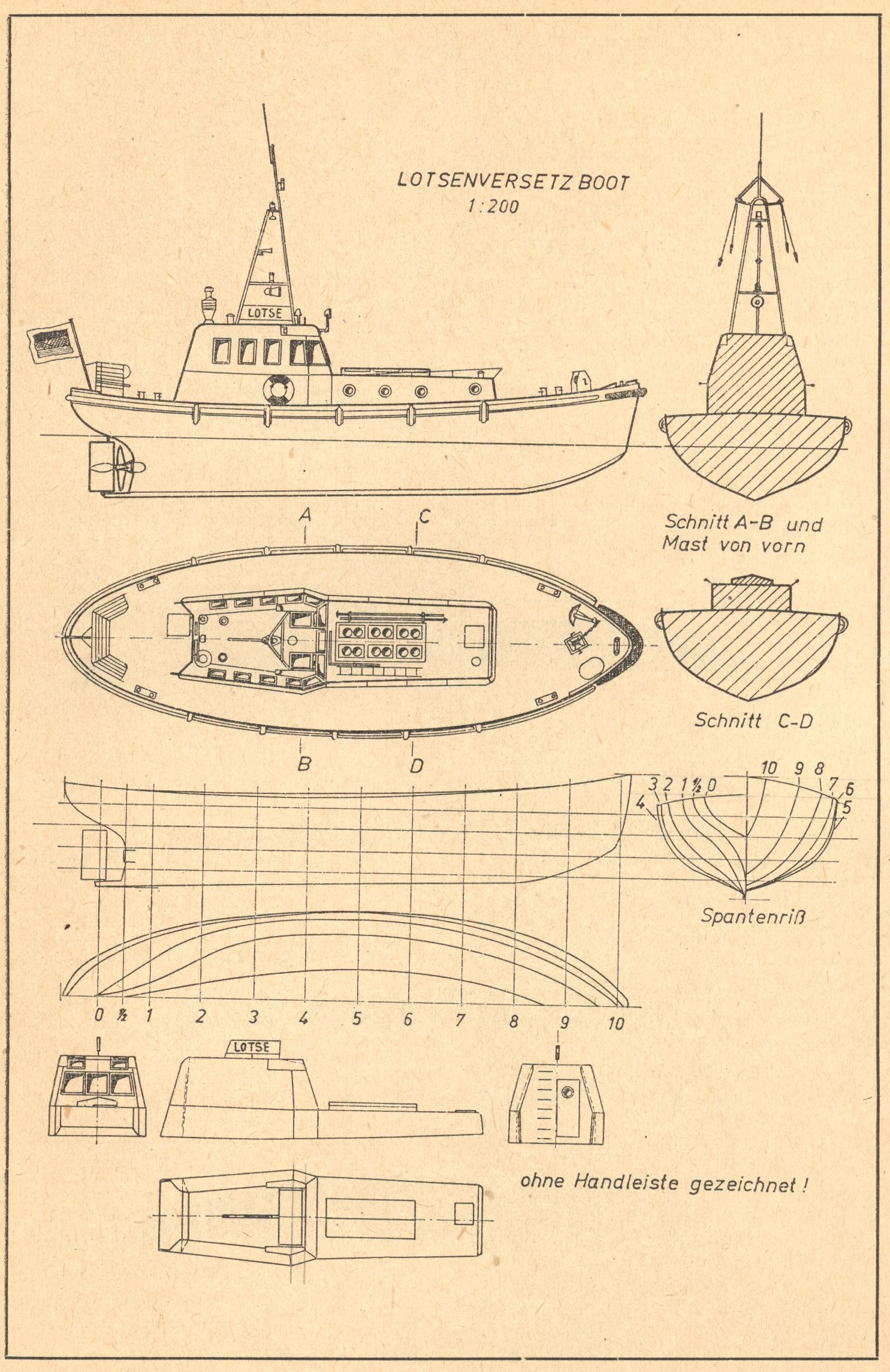 Als gebürtiger Rostocker war ich als Kind oft in Warnemünde zu Besuch bei meinen Großeltern. Die kleinen Nussschalen der Lotsenboote haben mich fasziniert, solange ich denken kann. Man konnte sie von der Mole aus häufig beobachten. Bei fast jeden Wetter begleiteten sie ein- und auslaufenden Schiffe, um Lotsen an Bord zu bringen oder abzuholen. Bei schweren Seegang war es beeindruckend, wie sie sich schwankend und hüpfend durch die Brecher kämpften. Über der Zeichnung im Buch "Vom Wikingerboot zum Tragflächenschiff" habe ich oft und lange gebrütet und muss sogar begonnen haben, den Linienriss zu vergrößern. Leichte Narben im Papier führe ich auf einen Stechzirkel zurück. Im Schifffahrtsmuseum habe ich mir fast die Nase an der Glasscheibe platt gedrückt, die mich von meinem Lieblingsmodell trennte. Schon damals wäre es ein sehr geeignetes Projekt für einen Anfänger im Schiffsmodellbau gewesen - da einfach und überschaubar. Irgendwie konnte ich mich bisher jedoch dazu durchringen, wirklich damit zu starten.