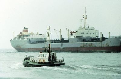 Muss in Rostock sein, denn der Schwimmkran ist der Lange Heinrich. Man beachte die damals noch als innovativ gehaltenen Fender und die eckigen Fenster.