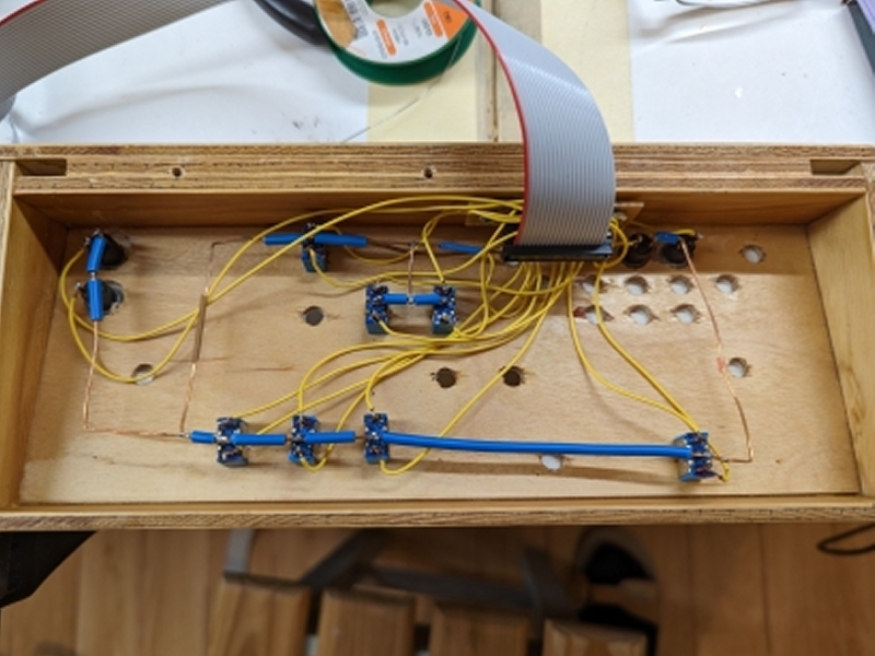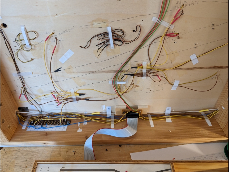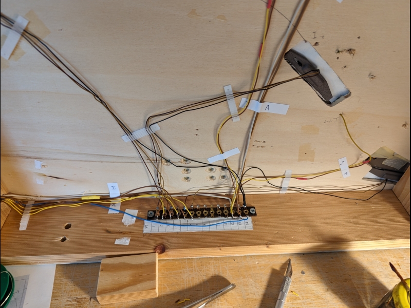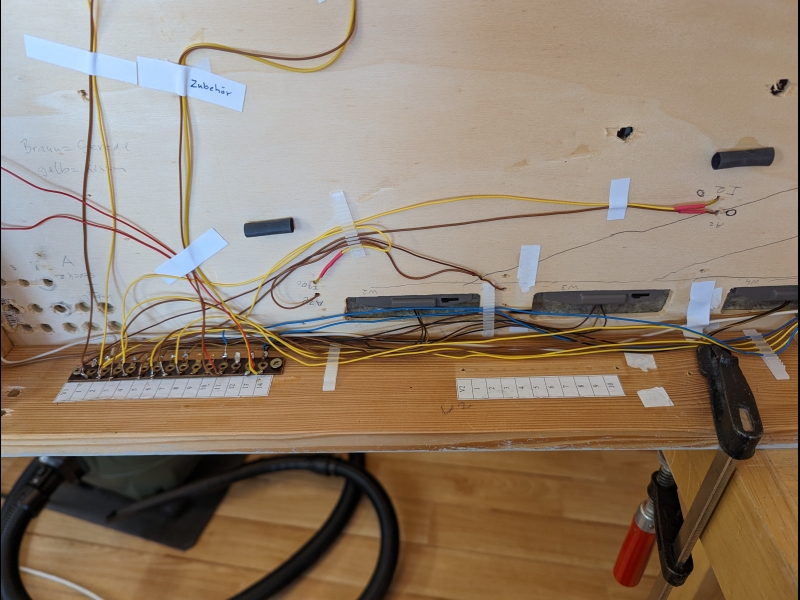 AnlagentechnikHier ist beschrieben, wie es unter der Haube bei der Anlage aussieht. Dies ist ein Thema, was Modellbahner häufig nicht so gerne veröffentlichen. Auch meine Verdrahtung ist nicht perfekt und optisch "gewöhnungsbedürftig". Die Anlage hat seit 2005 eine längere Geschichte mit diversen Umbauten hinter sich. Aus einer schmalen Kreisanlage mit verdeckten Schattenbahnhof und vielen abschaltbaren Abschnitten für analogen Betrieb wurde im Laufe der Jahre ein großes Eisenbahnmodul mit relativ großzügiger Streckenführung. In einer Übergangsphase sollte digitaler und analoger Betrieb möglich sein. Zum Schluss blieb nur noch der Digitalbetrieb als sinnvolle Betriebsvariante übrig. Alle diese Umbauten hinterließen ihre Narben an der Unterseite. Anfang 2023 nahm ich einen kleinen elektrischen Unfall zum Anlass, die Anlage neu zu verkabeln. Dabei sind die letzten Reste der analogen Verkabelung entfernt worden. Alles wurde bezeichnet, dokumentiert und vor allem vereinfacht. Die ursprünglichen Bezeichnungen habe ich beibehalten. Daher fehlt zum Beispiel eine Weiche 1, die es seit längerem nicht mehr gibt. Oder, der Verteiler 2 wurde beim Umbau nicht mehr benötigt und deshalb abmontiert. Die Anlage wurde für die Arbeiten an der Unterseite einfach senkrecht auf der Werkbank festgespannt. Das Ergebnis ist jetzt ein aktueller Verdrahtungsplan und eine halbwegs aufgeräumte Unterseite, bei dem auch die Kabel der bisher nicht angeschlossenen Lampen und Laternen sicher verstaut sind. Wie man sieht lege ich keinen Wert auf rechtwinklige Verlegung oder Bündelung der Drähte. Die Elektronen schaffen es auch so um die Kurven und Ecken. Die Drähte sollen jedoch ihrem Zweck dienenden einheitliche Farbe haben, gut verfolgbar sein und an wichtigen Stellen eine Bezeichnung bekommen. Und es darf nichts herunter hängen. Hinweis zu den Bildern: Wir schauen auf die Unterseite der mit der Vorderseite nach unten aufgespannten Anlage. Daher sind rechts und links vertauscht, als wenn man vor der waagerecht aufgestellten betriebsbereiten Anlage stehen würde.