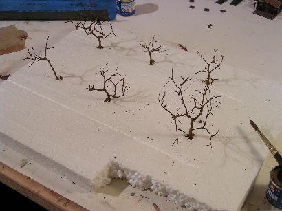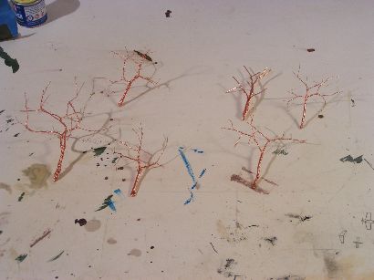 Das Gebilde wird mit mattbrauner Farbe mehrmals angestrichen. Dazu ist es günstig, wenn man die Bäumchen in ein Stück weiches Styropor steckt.