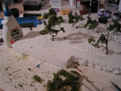 Das Beflockungsmaterial wird in kleine Stücke geschnitten und mit Ponal angeklebt. Ich nehme Classic-Foliage dunkelgrün (Noch 07316).