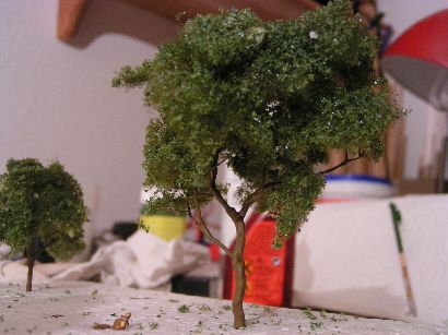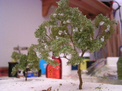 Hier zeige ich, wie man Bäume aus Draht und Beflockungsmaterial bauen kann. Die Bäume der Streuobstwiese sind auf diese Weise entstanden