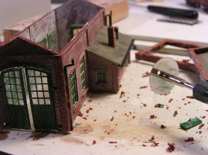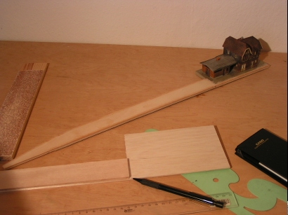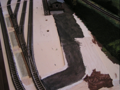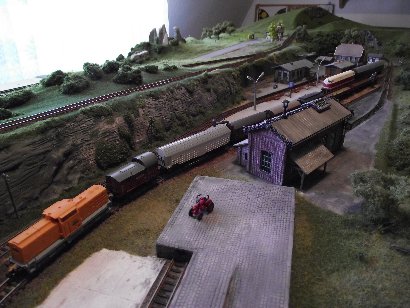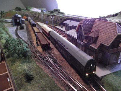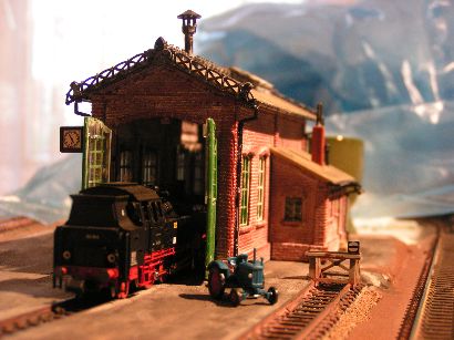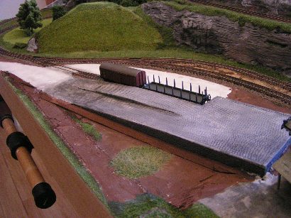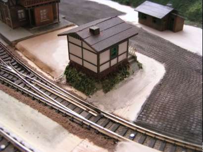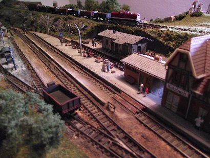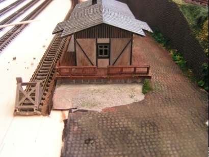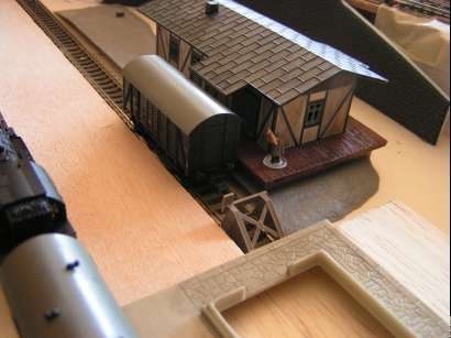 Bahnhof KatzbachBahnhofsgebäude und Vorplatz liegen in der Mitte der Anlage. Sie müssen deshalb zuerst gestaltet werden, weil sie später nicht mehr so gut zugänglich sind. Im Januar 2009 habe ich die Gleisführung im Bahnhofsbereich geändert. Die Paradestrecke ist abgebaut. Die linke Bahnhofseinfahrt wurde gefälliger gestaltet und bekam ein zusätzliches Gleis für eine Kombi-Rampe. Die Umgestaltung war eine ziemlich spannende Angelegenheit. Immerhin mußte ich die Bogenweiche im rechten Ausfahrtsbogen, die Weiche am vorderen linken Anlagenrand und die linke Ausfahrtsweiche aus der Gleisen nehmen. Die Bogenweiche wurde durch ein Stück Gleis ersetzt. Die linke Bahnhofsausfahrt bekam eine komplett neue Gleisführung. Insgesamt eine ziemlich knifflige Sache, da ich ja nichts von den gestalteten Teilen kaputt machen wollte. Mit viel Vorsicht und Geduld ist es gelungen.