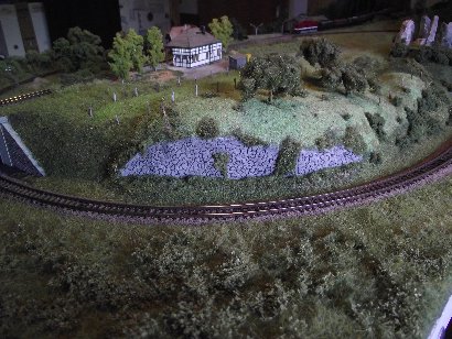 Aber auch dabei blieb es nicht. Mitte 2013 kam es wohl zu dem radikalsten Umbau (Katzbach 21). Die Anlage wurde nach rechts auf 215 cm und nach hinten auf 80 cm vergößert. Die engen Radien gehörten damit der Vergangenheit an. Hinzu kam rechts noch ein Ecksegment, das zwar abnehmbar ist, aber eigentlich zum der Anlage gehört. Auch vom Kreisverkehr habe ich mich verabschiedet. Der Schattenbahnhof unter dem Berg wurde entfernt und auch die Berge wurden versetzt. Die neu gewonnene Fläche wurde nach und nach ausgestaltet. Den derzeitigen Stand zeigt der Gleisplan unten