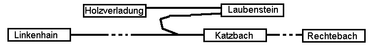 Der Betrieb läuft jetzt wie folgt: Am Tagesanfang ist der Bahnhof Katzbach leer und es stehen in den 3 Gleisen im Schattenbahnhof ein Personenzug und zwei Güterzüge mit nicht mehr als 7 zweiachsigen Wagen - in jede Richtung einer. Morgens kommt ein Güterzug aus Rechtebach und einer aus Linkenhain. Sie stellen Wagen in Katzbach ab. Einer fährt mit den restlichen Wagen weiter. Die Lok des anderen versorgt die Wagen an die Ladestellen und stellt per Bedienfahrt Leerwagen an die Holzverladung. Dabei muss in Laubenstein Kopf gemacht werden. Anschließend nimmt auch sie ihre verbleibenden Wagen wieder auf den Haken und verlässt den Bahnhof. Nachmittags geschieht das Gleiche umgekehrt. Ein Zug nimmt die für ihn bestimmten Wagen mit. Der andere holt die Wagen von der Holzverladung ab und nimmt ebenfalls Wagen aus Katzbach mit. Zwischendurch fahren Personenzüge (es ist immer derselbe) hin und her. Eingefleischten Betriebsbahnern wird auffallen, dass ich hier nichts über Wagenkarten und Frachtzettel schreibe. Nun, soweit wollte ich den Betriebsablauf nicht "FREMOisieren". Es kann ja leider in meinem Schattenbahnhof nicht rangiert werden. Somit können Loks dort auch nicht umgesetzt werden und deshalb kommen Güterzüge beim nächsten Auftauchen aus der falschen Richtung. Mich stört das nur wenig. Bei der Planung einer nächsten Anlage würde ich das natürlich berücksichtigen. In meiner heute vorhandenen Mini-Welt muss ich halt improvisieren. Fahrplanbeispiel