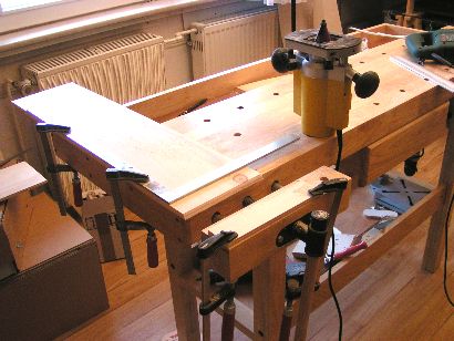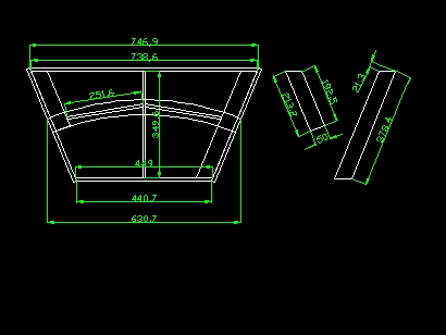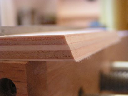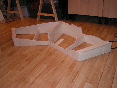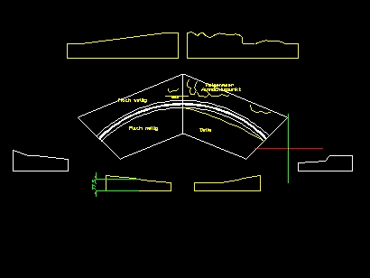 Ein 90°-Bogen aus zwei ModulenManchmal führt ein Bogen zum nächsten. Konnte ich mit der Eckmühle und den beiden 15°-Modulen ein L-förmiges Layout aufbauen, braucht es für ein U im Raum einen weiteren 90°-Bogen. Nachdem ich das CAD-Programm eine ganze Weile mit möglichen Varianten gequält hatte, entschloss ich mich für zwei 45°-Module mit knapp 80 cm an der längeren Kante und 80 cm Gleisradius. Die Module sind als Gruppe konzipiert, können aber auch separat eingesetzt werden. Jeweils eine Seite hat ein Hangprofil, die andere das übliche flache Profil. Je nachdem, wie man die Module zusammenschraubt, ergibt sich ein Bogen mit flachem Profil an den Enden und Hang in der Mitte, oder Hangprofil an beiden Enden und flaches Profil in der Mitte. Einzeln verwendet, sind die Module auch als Adapter Hang-Flach verwendbar. Das eine Modul soll mit sanft gewellter Landschaft ausgestattet werden, das andere bekommt einen (Kletter-?)Felsen mit Aussichtspunkt. Das Felsenmodul kann für FREMO-Treffen als Adapter für "Aula" (Hang-Aula auf Flachprofil) verwendet werden. Bogenmodule sind mit Heimmitteln schwierig herzustellen. Das fängt schon damit an, dass die Seitenwände auf Gehrung geschnitten oder gefräst werden müssen. Für meine 15°-Module habe ich mir extra eine Vorrichtung ausdenken müssen, damit ich die 7,5°-Gehrungen mit der Oberfräse fertigen konnte. Zu meiner Freude ist es mir gelungen, einen 22,5°-Fräser zu ordern, der in meine Hobby-Oberfräse passt (diese Spezialfräser haben meist einen Schaft von 12 mm, während meine billige Fräse nur 6 und 8 mm Fräser aufnehmen kann). Die Fräser waren nicht ganz billig. Trotzdem habe ich gleich noch einen 15°-Fräser mitbestellt - für 30°-Module. Man weiß ja nie ...