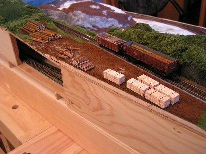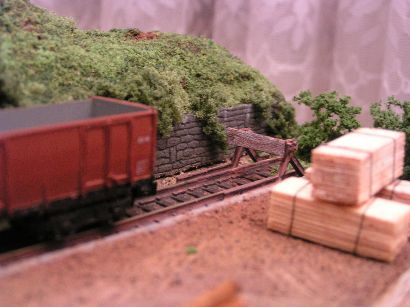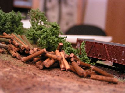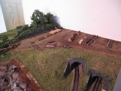Holzverladung und WaldhangLange habe ich überlegt, was ich aus dem oberen Ende der Bergstrecke mache. Sägewerk? Haltepunkt? Ladestrasse? Zum Schluss entschied ich mich für eine Verladestelle für Holz. Der Berg zwischen der Verladestelle und der darunter liegenden Tunneleinfahrt wurde nach vorne erhöht, um eine bessere optische Trennung zu erhalten und den Tunnel im Vordergrund glaubhafter zu machen. Gestrüpp sorgt inzwischen für noch mehr Trennung. Auf Seite Verladestelle stützt eine Mauer den Berg ab. Die Oberfläche der Verladestelle besteht aus einer Mischung aus Kaffeesatz, Zimt und weißen Pfeffer. Das Ganze wurde nach dem Trocknen mit verdünnter weißer Farbe patiniert. Mit einer Drennscheibe vom Dremel habe ich die Fahrspuren eingekratzt. Die Stämme waren zunächst gebeizte und grün patinierte Schaschlikspieße. Später habe ich Zweige aus einem alten Reisigbesen verwendet. Mit der Erweiterung der Anlage wurde auch der Verladeplatz größer. Es fehlt noch eine Verladebrücke oder ein fahrbarer Lader.