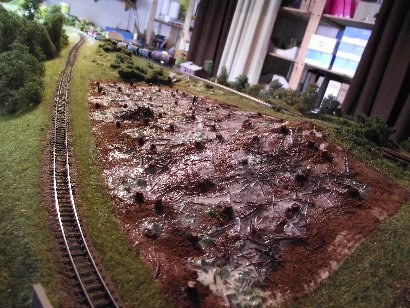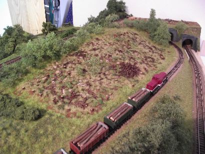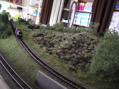 Hinter dem Verladeplatz entstand ein abgeholzter Hang. Geübt habe ich für dieses Thema bereits mit dem Windbruch am Auslieferlager. Braune Farbe, Kaffesatz und kleine Ästchen bilden die Grundlage. Darauf kommt in mehreren Schritten eine bunte Mischung aus Grasbüscheln, dazwischen Sägespäne. Zum Schluss werden um die Fläche ein paar Büsche und kleine Bäume gepflanzt. Auf der Fläche selbst beginnen bereits die ersten Büsche wieder zu wachsen