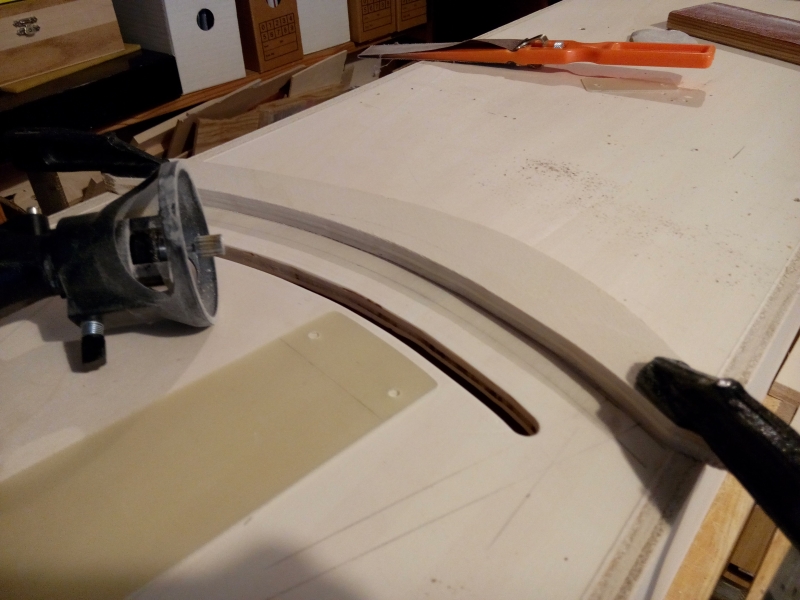 Die Schleppweiche meines Schattenbahnhofs soll jedoch exakt geführt werden, damit ich später eventuell einen motorischen Antrieb nachrüsten kann. Daher wird die Schleppweichenbühne durch einen Arm an der Unterseite geführt - beschreibt also eine Kreisbahn. Im Bild sieht man den dafür gefrästen Schlitz in der Grundplatte und einen gestressten Dremel. Um hier ohne Schreinerwerkzeug genau genug arbeiten zu können, habe ich eine kreisbogenförmige Führung für den Fräser aufgespannt. Die beiden Innenkanten des Schlitzes habe ich separat gefräst, nachdem mit einer Reihe von Bohrungen schon einmal das meiste Holz entfernt war. Es war eine recht mühsame Sache!