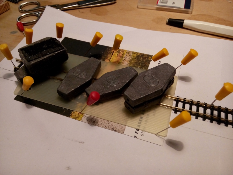 Hier wird das Flexgleis auf der Schleppweichenbühne festgeharzt. Untergelegt ist eine dünne Pappe, damit das Gleis wirklich auf der GFK-Platte aufliegt. Für den richtigen Abstand der beiden Schienen, sorgen die Schwellenbänder und eine sehr genaue gerade Ausrichtung des Ganzens. Zum Andrücken sind die Schienen mit Angelbleistücken "begraben".