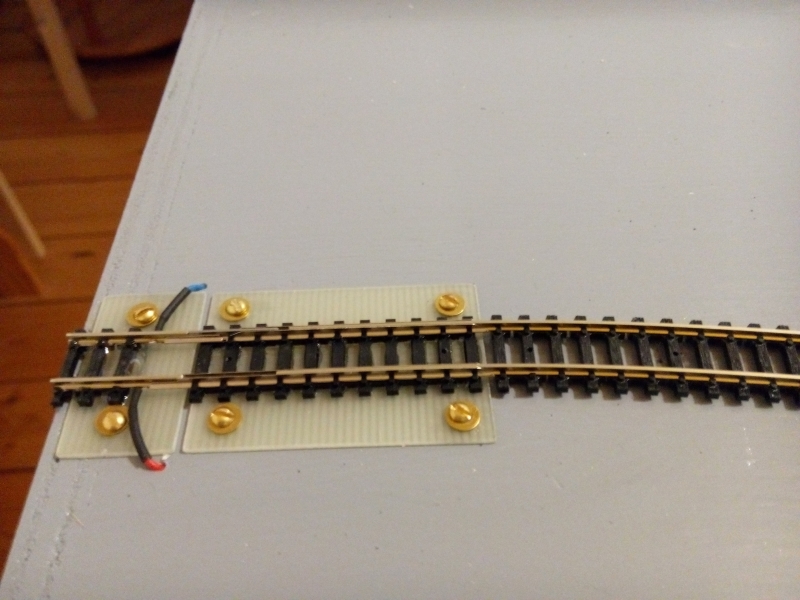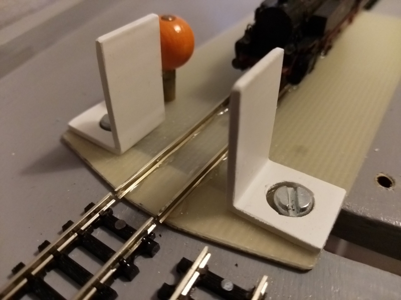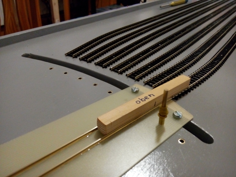 Damit die Schleppweiche wirklich ausreichend reproduzierbar mit den Gleisen fluchtet, wird der Arretierungsstift in Messinghülsen geführt, die in die Grundplatte eingeklebt sind. Und damit das Gleis fluchtend und ohne Versatz verlegt werden kann, gibt es eine einfache Vorrichtung.