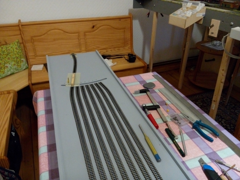 Insgesamt 9 Gleise sind zu verlegen. Sie werden zunächst mit Gleisnägeln fixiert und sollen nach ausführlichen Test später mit Harz gesichert werden.