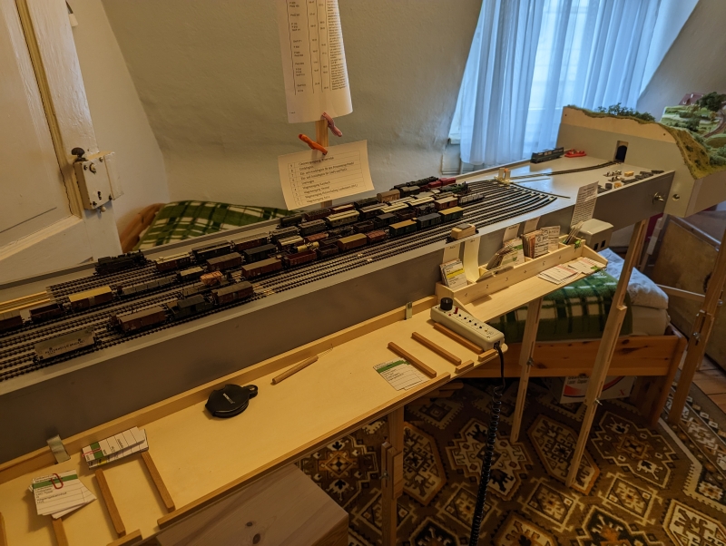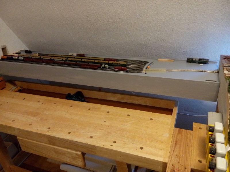 Schattenbahnhof GrauenbergenLange habe ich auf dem Thema Schattenbahnhof herumgedacht. Separat neben der Anlage? Unter der Anlage? Wie groß? Wieviele Gleise? Weichenstrasse, Schleppweiche oder Schiebebühne? Bei Fremo-Treffen sind offene Fiddle-Yards üblich, in denen rangiert werden kann, oder auch "gefummelt", also Fahrzeuge von Hand umgestellt werden dürfen. Letztendlich bin auch ich bei einer solchen Konstruktion gelandet, denn auch bei mir soll eine Fahrzeugsortierung möglich sein. Versuche mit einer platzsparenden Schiebebühne verliefen nicht sehr erfolgreich. Am Ende entschloss ich mich zu einer "klassischen" Konstruktion per Schleppweiche - also einen Schattenbahnhof vom Typ "Frankental". Frankental wurde in halbierter Länge mehrere Jahre beim Silvesterlayout eingesetzt. Daher konnte ich die Brauchbarkeit praktisch überprüfen und begann 2019 mit dem Bau einer eigenen Version. Da mein Schattenbahnhof nicht für Fremo-Treffen vorgesehen ist, habe ich ihn als 1,6 m langen und 30 cm breiten Monolithen konzipiert. Das Teil ist damit zur Not transportabel. Ungewöhnlich für Fremo-Fiddle-Yards, läuft das mittlere Gleis am Ende bis zum Modulrand, denn dort führt die Strecke gegebenenfalls durch die Zimmerwand ins Nachbarzimmer. Dort sind entweder wieder Module oder die Einfahrt in eine Train-Safe-Röhre. Von den jeweils 4 Gleisen auf jeder Seite des durchgehenden Gleises haben die vorderen die volle Länge - für Wendezüge und Wagenspeicher. Die hinteren enden bereits 20 cm vor dem Rand. Hier können Loks und/oder Wagen in ein anderes Gleis umgesetzt werden, damit ein Zug auch umlaufen werden kann. Alle Gleise sind von Minitrix.