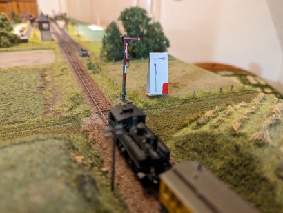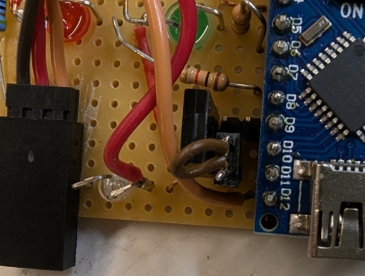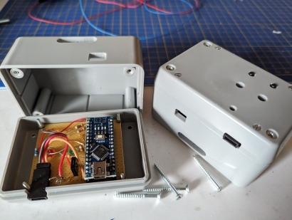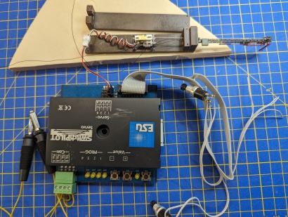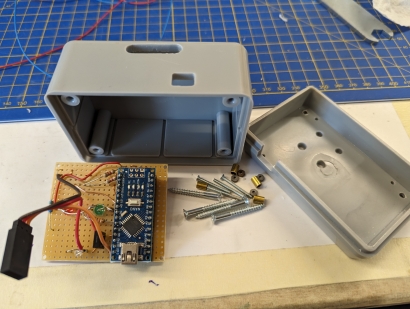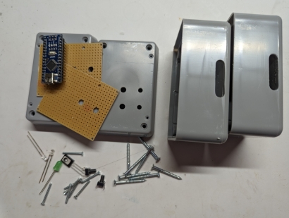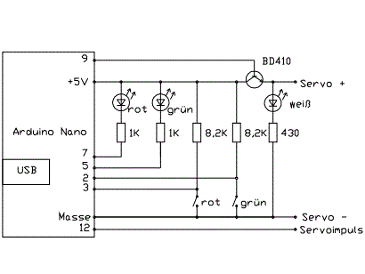 SchaltboxDie Platine sollte in ein Gehäuse passen, wie sie auch für die FREMO-Loconet-Box verwendet wird. Das bedeutet eine Größe von 60x50 mm. Ich baue Elektroniken mit so wenig Elementen und wenigen Exemplaren gerne auf Lochrasterplatten und erspare mir so das Ätzen einer speziellen Platine. Die Platte trägt auch 3 LEDs und 2 Kurzhubtaster und ist mit 4 M2-Schrauben auf 5,5 mm Abstandshalter am Deckel der Box befestigt. Die LEDs strahlen in Richtung Platinen-Unterseite und auch die Kurzhubtaster sind auf der Kupfer-Seite eingelötet. Schaltung und Verdrahtungsplan siehe weiter unten beim Download. Tip für die genaue Lage der Bohrungen im Deckel: An den Ecken der fertig zugeschnittenen Lochrasterplatte werden die Löcher, in der die M2-Schrauben kommen, vorsichtig auf 2 mm aufgebohrt. Der Mittelpunkt der LEDs und der Taster liegt zwischen zwei Lochrasterbohrungen. An diesen Stellen wird mit einem Handbohrer eine zusätzliche 1 mm Bohrung angebracht. Die Platine wird in den Deckel an die richtige Stelle gelegt und mit einem 2 mm Handbohrer die Stellen für die 2 mm Bohrungen "markiert". Diese werden dann erst mit 1 mm durchbohrt und dann auf 2 mm aufgebohrt. Die Platine wird eingelegt und die 2 mm Schrauben eingesetzt. Jetzt können auf dieselbe Weise per 1 mm Bohrer die Positionen der LEDs und Taster markiert. Die Platine wird wieder entfernt, die markierten Stellen gebohrt und dann auf den richtigen Durchmesser aufgebohrt (bei mir: Taster 2,5 mm, rote und grüne LED 5 mm, weiße LED 3 mm). Danach können die Löcher für die LEDs auch in der Platine aufgebohrt werden. Schaltungsbeschreibung (Bild 9): Die Stromversorgung von Nano und Servo erfolgt über den USB-Anschluss des Nanos. Der Nano erzeugt an Pin 12 den Servo-Impuls, steuert die Status-LEDs (rot, grün) und fragt die Taster ab. Die Taster sind als Pull-Down realisiert, deshalb braucht es die Pull-Up-Widerstände (Hätte man auch umgekehrt machen können). Als Besonderheit steuert der Nano zusätzlich noch die Spannungsversorgung des Servo-Ausgangs, damit das nervige Brummen des nicht sehr stabil arbeitenden Micro-Servos in der Endlage unterdrückt wird. Das Servo bekommt also nur dann Betriebsspannung, wenn es sich bewegen soll. Zwischen den Bewegungen ist es abgeschaltet. Eine weiße LED signalisiert den Spannungszustand des Servos. Dieses Prinzip hat sich in der Praxis leider nicht bewährt (siehe unten 'Praxistests'). Software: Implementiert sind der Betriebs-Modus und ein Kalibrierungs-Modus. Im Betriebsmodus bewirkt das Betätigen eines Tasters die Fahrt in eine der Endlagen und die Umschaltung der Status-LEDs (rot-grün). Im Kalibrierungs-Modus können die beiden Endlagen eingestellt werden. Diese werden nach erfolgter Kalibrierung im EEPROM des Nanos gespeichert, stehen also auch nach Ausschalten und wieder Einschalten zur Verfügung. In den Kalibrierungs-Modus gelangt man, indem man gleichzeitig beide Taster drückt, erst den der bereits erreichten Endlage, dann den jeweils anderen. Die angewählte Endlage kann jetzt durch wiederholtes Drücken der Taster justiert werden. Dabei sollte die Stellung der Flügel am Signal beobachtet werden. Während der Kalibrierung bleibt das Servo ständig unter Strom, was sich gut an der weißen LED erkennen lässt. Betätigt man etwa 5 Sekunden keine der beiden Taster, fällt die Software zurück in den Betriebsmodus und merkt sich den eingestellten Wert im EEPROM. Hat man sich mit den Endlagen mal vertan, kann man statt des Signals auch ein normales Servo anschließen, die Endlagen auf die Mittelstellung setzen und dann mit dem Signal noch einmal probieren. Source-Code siehe unten beim Download, leider recht sparsam kommentiert.