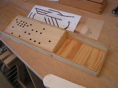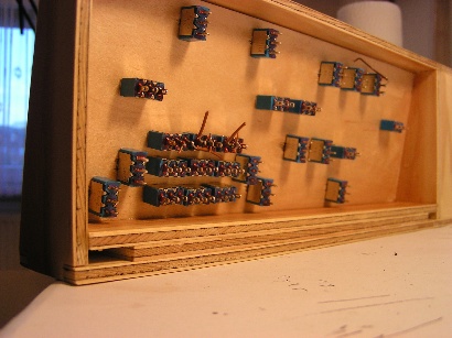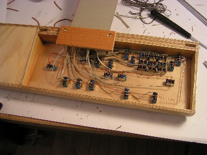 Das Stellwerk (für Analogbetrieb)Lange habe ich den Bau eines Stellpultes und die endgültige Verkabelung vor mir hergeschoben. Das war auch gar nicht so verkehrt, denn beim Spielen hat sich herausgestellt, dass es oft nicht ausreicht, dass Gleisabschnitte nur durch die "denkenden" Weichen abgeschaltet werden. Auch habe ich die Überwachung des Schattenbahnhofes per Lichtschranken wieder verworfen. Statt dessen ist jedes der drei Gleise im Schattenbahnhof in drei Teile geteilt, die sich einzeln abschalten lassen. Zum Abstellen eines Zuges schalte ich einfach den Zielbereich ab, in dem die Lok stehen bleiben soll. Damit kann ich ein Gleis sogar für zwei Triebfahrzeuge nutzen. Ich muss mir halt über die Längen von Gleis und Zug sicher sein, dass es zu keinem Auffahrunfällen kommt und genau merken, wo welcher Zug steht. Außerdem ist die Einfahrt und die Ausfahrt in den Schattenbahnhof abschaltbar. Ich könnte selbst bei vollen Schattenbahnhof in den Tunnel einfahren, anhalten, Zug abschalten, einen Zug ausfahren lassen und dann mit dem eingefahrenen Zug das frei gewordenen Gleis nutzen. Die Weichen werden über Kippschalter geschaltet. So kann ich an der Stellung des Schalters sehen, wie die Weiche stehen muss und erspare mir auch hier eine Rückmeldung.