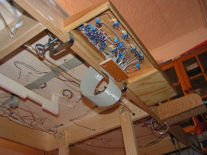 Das Stellpult wird mit zwei Laubsägezwingen befestigt, kann bei Nichtgebrauch unter die Anlage geklappt, und dort an einer Halterung wieder angeklemmt werden. Eine Halterung für den Fahrtrafo wird ähnlich angeklemmt