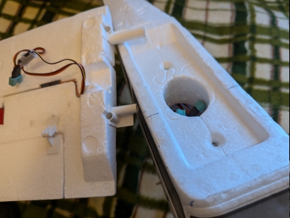 Noch ist die Tragfläche unfertig, jedoch ist die Verkabelung der Servos bereits erledigt. Auch die Verbindungsstecker zum Empfänger sind angelötet. Zeit für einen Funktionstest mit montierter Fläche. Das Bild zeigt anschaulich, wie die Tragfläche mit Hilfe des Adapters auf dem Rumpf sitzt.