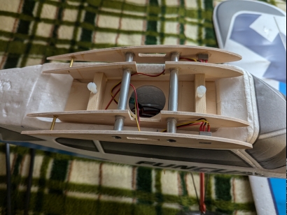 Eine Gewichtskontrolle ergab jetzt bereits mehr als 300g, inklusive Servos. Heißt also, dass ich im Vergleich zur Originalfläche (390g) kaum Gewicht sparen werde. Verbaut sind übrigens 2 Servos HS-80. Ich halte die in der originalen Fläche verbauten 9-g-Servos für unterdimensioniert.