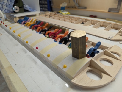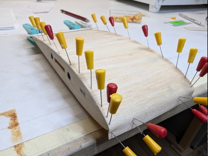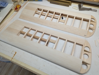 Nach mehrmonatiger Pause ging es dann im Frühjahr 2025 endlich los mit dem Bau der eigentlichen Tragfläche. Hier entstehen die Rippen im klassischen Blockverfahren aus 2 mm starken Balsa.