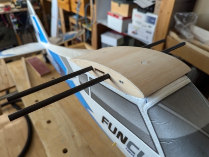 Die Steckung besteht aus 2 Kohlefaserstäben von 8 mm Durchmesser. Das ist vermutlich überdimensioniert, ich wollte jedoch auf Nummer sicher gehen, denn ein einzelner solcher Steckungsstab hatte sich bei dem ähnlich schweren Nurflügler Rumba als zu schwach erwiesen, sodass ich dort mühsam einen zweiten Stab nachrüsten musste.