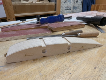 Der Adapter, hier noch unbeplankt, sitzt zur Probe in der Vertiefung im Rumpf. Passt soweit.