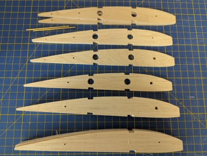 Rippensatz fertig. Oben die Schablonen. Nach unten fortsetzend die Varianten von der Wurzelrippe bis zum Ende der Tragfläche mit den entsprechend der Position anderen Ausschnitten und Öffnungen. Die Querruder werden später aus der fertigen Tragfläche heraus getrennt. Da braucht in den Rippen zunächst nichts berücksichtigt werden.
