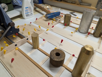 Die Ohren, oder eigentlich die Randbögen, sind angebracht. Die obere vordere Beplankung wird aufgezogen. Noch fehlt die vordere Nasenleiste, der Rest der Beplankung, usw.usf.
