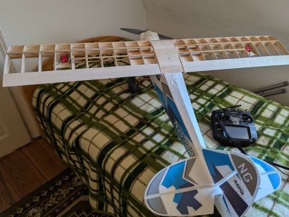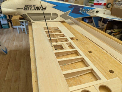 Und auch der Sender kann bereits für die neue Tragfläche programmiert werden. Es stellte sich heraus, dass eine Kopie der Einstellungen von der Funcub bereits Querruderausschläge in die richtige Richtung ergibt. Es brauchte nur die Höhenruderkompensation der Landeklappen abgeschaltet werden (wegen nicht vorhandener Landeklappen). Im Flugbetrieb wird später die Neutral-Lage vom Höhenruder noch einzustellen sein, denn diese ist bei der Funcub ebenfalls von der Stellung des Gebers der Landeklappen abhängig.