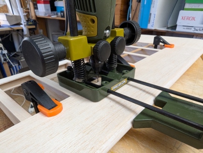 Es wurde tatsächlich spannend, jedoch anders. Die Reichweite meiner Proxxon FF 230 reichte leider nicht aus, um den Abstand Nasenleiste zum Schlitz zu überbrücken. Also musste eine andere Lösung her: Fräsvorsatz plus Parallelanschlag für die kleine Proxxon Bohrmaschine. Gut justiert und in drei Durchgängen sehr vorsichtig immer tiefer gefräst. Die Tragfläche wurde dafür über Kopf an einer Kante festgespannt. Mit dem Ergebnis bin ich sehr zufrieden. Eingeklebt werden die Halterungen jedoch erst unmittelbar vor dem Bespannen, wenn alle Schleifarbeiten wirklich abgeschlossen sind.