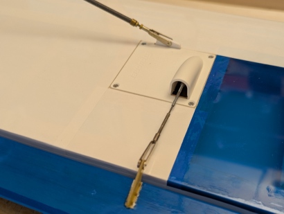 Bespannfolie ist drauf. Einer der letzten Handgriffe war es, die Ruderanlenkung anzubringen. Im Bild sieht man sehr schön den "Knoten" von Servoabdeckung, Strebenhalterung und Strebe. Jetzt noch Haken in die Wurzelrippen schrauben, für den Verbindungsgummi, der durch den Tragflächenadapter läuft. Dann könnte ein Testflug starten, wenn da nicht das Gras noch hoch auf der Flugwiese stehen würde. Es ist Juni und die nächsten Tage soll das Wetter heiß und trocken werden. Die Bauern sind bereits fleißig am Heu machen. Irgendwann demnächst wird hoffentlich auch mein Startplatz dran sein.