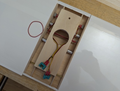 Klar, dass die Halterung für die Streben genau an der Stelle sein muss, wo sich die Servo-Abdeckungen befinden 😞 Andererseits: Der Servo-Rahmen ist vermutlich eine günstige Stelle für die Krafteinleitung. Ich möchte die Halterung so platzieren, dass die Streben nicht verstellt werden müssen, wenn man zwischen Holz- und Schaum-Fläche wechselt. Immerhin muss die Halterung auf beiden Seiten fast auf den Millimeter genau an die gleiche Stelle der Spannweite. Heißt also: Die neue Tragfläche sitzt ziemlich genau mittig und wohl auch rechtwinklig.