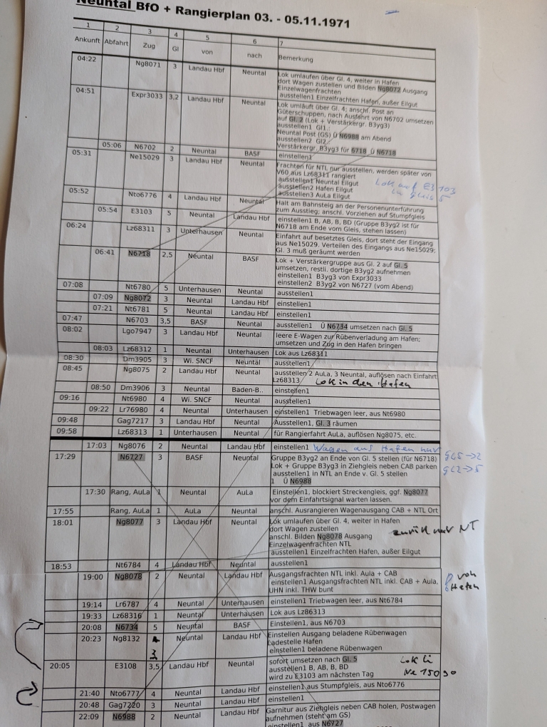 Das Ergebnis ist eine sehr kompakte Darstellung des Betriebsablaufs, so wie ich es verstehe. Der Ausdruck wird in Sichtweite an die Halterung vom Bahnhofsschild geklemmt. Wenn man einen Zeiger für die Abarbeitung benötigt, kann man eine zusätzliche Klemme benutzen. Hier die originale BfO aus XPLN und meine Arbeits-BfO, noch einmal nachkorrigiert und mit handschriftlichen Teilen (blaue Schrift) ergänzt.